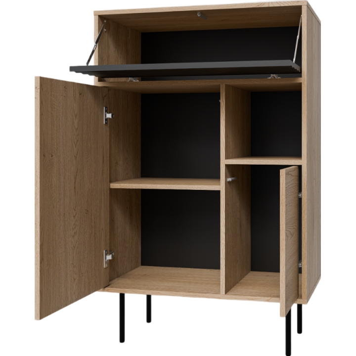 The ARD-KO76 sideboard offers both closed and open storage, giving flexibility in organising everyday items. The body in Cremona Oak is made from matte laminated board, while the black matte fronts combine MDF with PVC foil and matching board elements. The cabinet stands on black legs that give it a solid, balanced look.