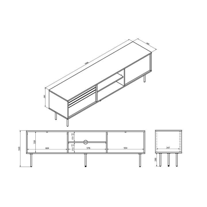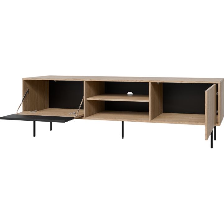 The ARD-TV180 TV unit offers a wide layout suited to large televisions and multimedia equipment. It combines open and closed storage, making it easy to organise consoles, set-top boxes and accessories. The Cremona Oak body is made from matte laminated board, while the black matte fronts use MDF with PVC foil and matching board components. Black legs give the unit a light and stable base.
