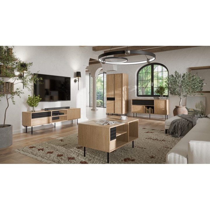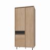 The ARD-SZ90 wardrobe is a deep, two-door model designed for both hanging and folded clothing. Inside, it includes a rail and shelves, offering a clear storage layout. The body is made from matte laminated board in Cremona Oak, while the front uses black MDF finished with PVC foil. Black legs elevate the structure and give the cabinet a balanced stance.