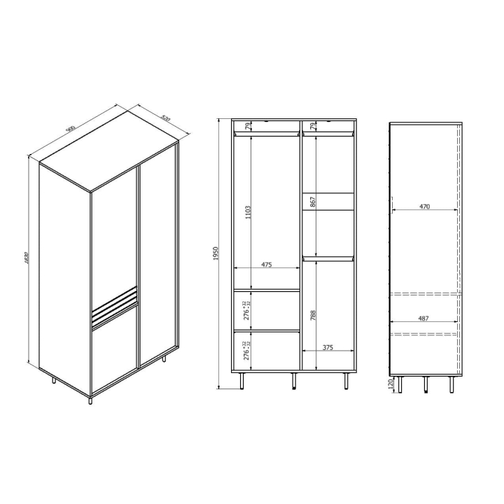 The milled black matte front creates a distinct sense of depth and a strong visual accent. Soft-close hinges ensure smooth and quiet door operation. Optional ARD-SZ90P shelves can replace the rail if a fully shelf-based interior is preferred. The wardrobe is delivered in three packages for easy transport.
