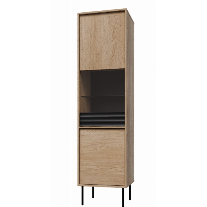 The ARD-WI50 display cabinet is a narrow unit designed for showcasing and storage. Inside, it includes tempered glass shelves and three laminated shelves, offering a mixed layout for décor, tableware or accessories. The body is made from matte laminated board in Cremona Oak, while the black matte front uses MDF with PVC foil and matching board elements. Black legs elevate the form and give it a lighter look.