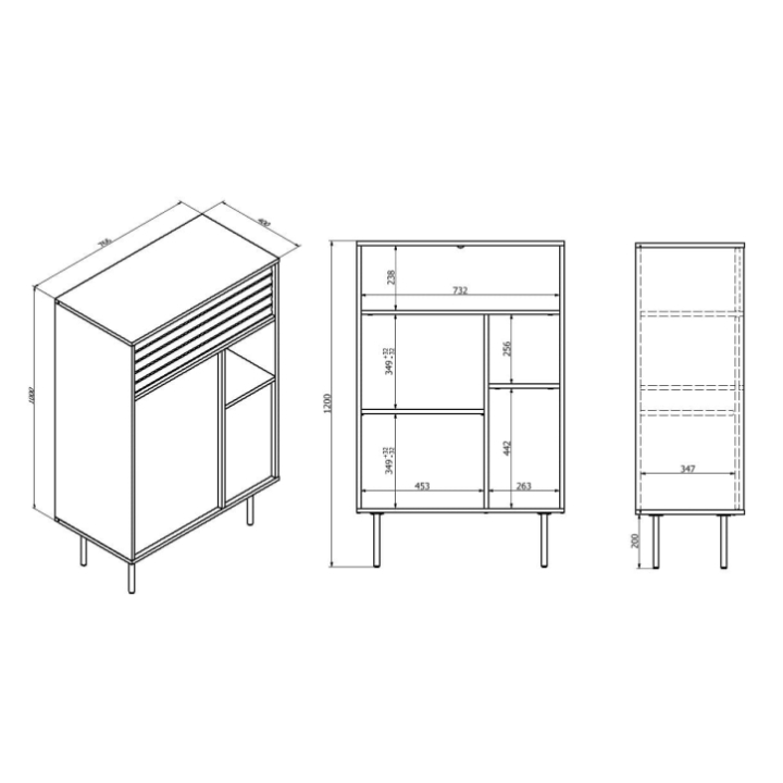The Restol Ebro 76 chest of drawers combines a bold, timeless silhouette featuring both concealed and open storage sections. The unit is 76.6 cm wide, 40 cm deep, and reaches 120 cm in total height measured with legs. The корпус itself measures 100 cm in height without legs. The piece stands on tall black legs, which visually lighten the design and add a modern touch.