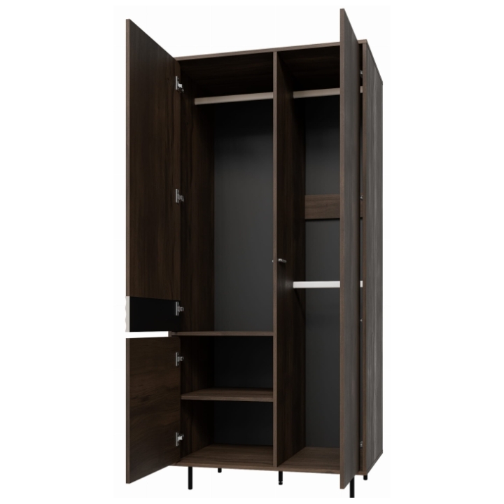 The wardrobe stands on high black legs, which is not only visually appealing but also helps maintain cleanliness underneath the furniture. The doors use soft-close silent hinges, ensuring gentle, silent, and noise-free closing, an important feature for those who value peace and comfort. Choosing a wardrobe with soft-close system means investing in everyday usability and comfort.
