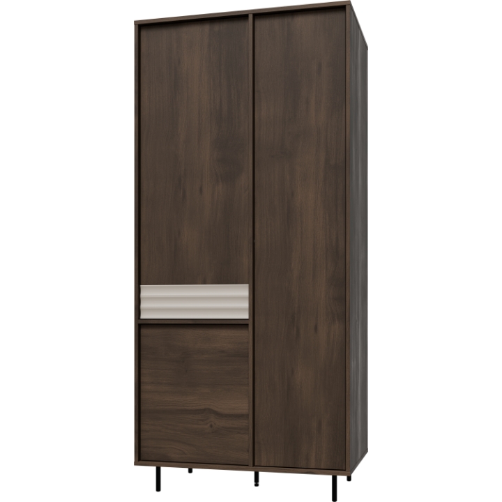 The Restol Wardrobe 90 Ebro by Restol is a slim, functional wardrobe with three doors, designed to fit small interiors. The wardrobe measures 90 cm wide, 40 cm deep, and 195 cm in total height (183 cm body + 12 cm legs). The furniture body is crafted in the deep shade of Baroque Oak, while the fronts combine Baroque Oak and a stylish Cashmere insert, making it a great addition to the bedroom or wardrobe closet.