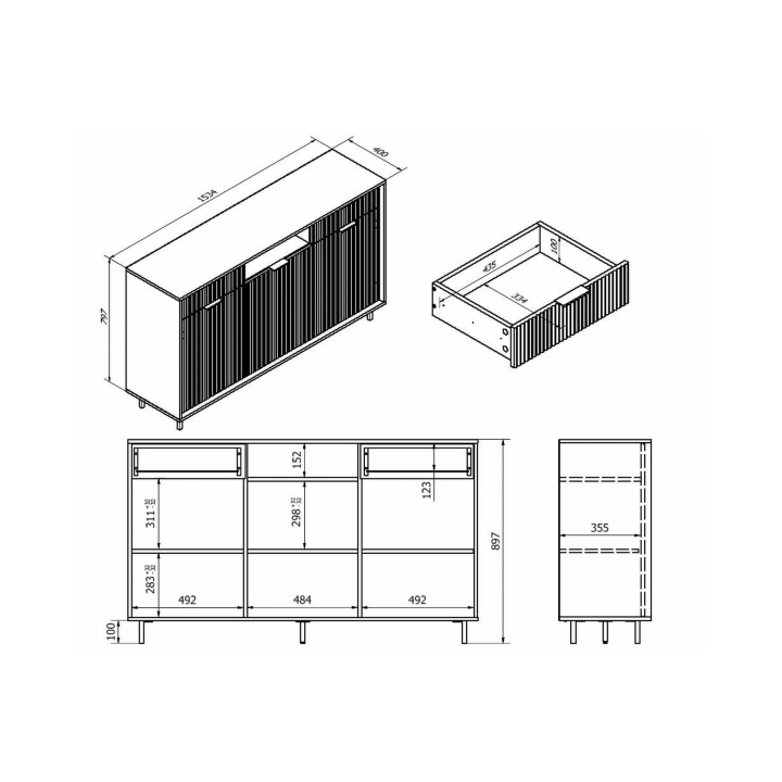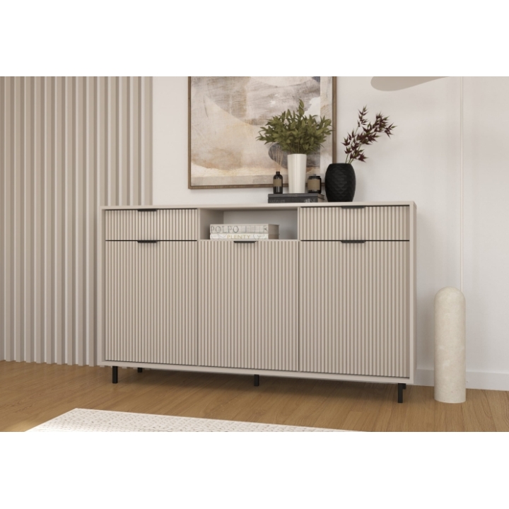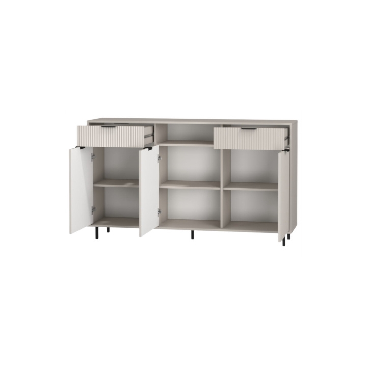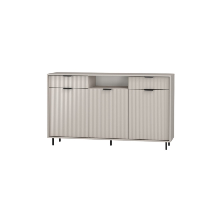 The dresser consists of three door sections that open into three cabinet compartments with shelves, and two drawers in the upper part. The drawers are equipped with full-extension runners, providing easy access to contents. The cabinet doors feature silent soft-close hinges, ensuring smooth and noise-free closing. The dresser stands on 10 cm black metal legs and has matching black metal handles.