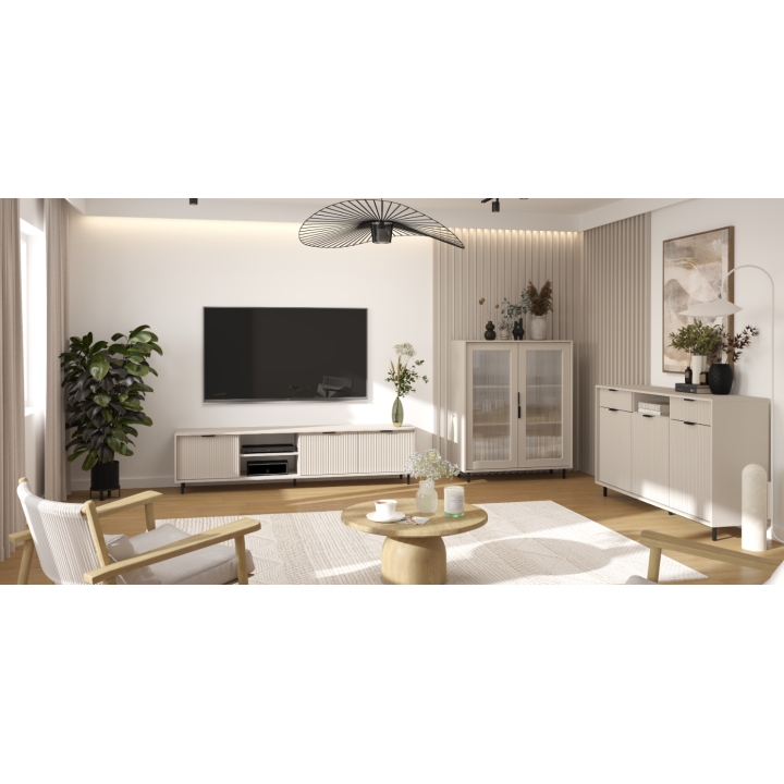 The body is made of matte laminated board. The top panel and fronts are made of MDF board wrapped in PVC foil. The fronts are decorated with careful vertical milling, giving the furniture a modern, three-dimensional, contemporary character.