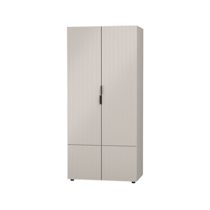 For improved everyday comfort, the doors include soft-close hinges, enabling smooth and silent closing. The wardrobe is completed with a matte black metal handle for easy opening.