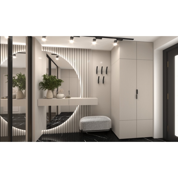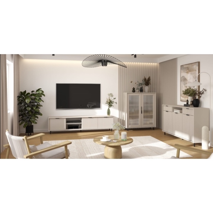 Below, there is a wide lower cabinet section, hidden behind a full double front panel, ideal for storing less frequently used items while keeping the design visually clean. The grooved door fronts are made from MDF wrapped in durable PVC foil and feature deep, precise routed (grooved) detailing, adding depth and an elegant design accent. The body (corpus) is built from matte laminated board, ensuring durability and surface resistance.