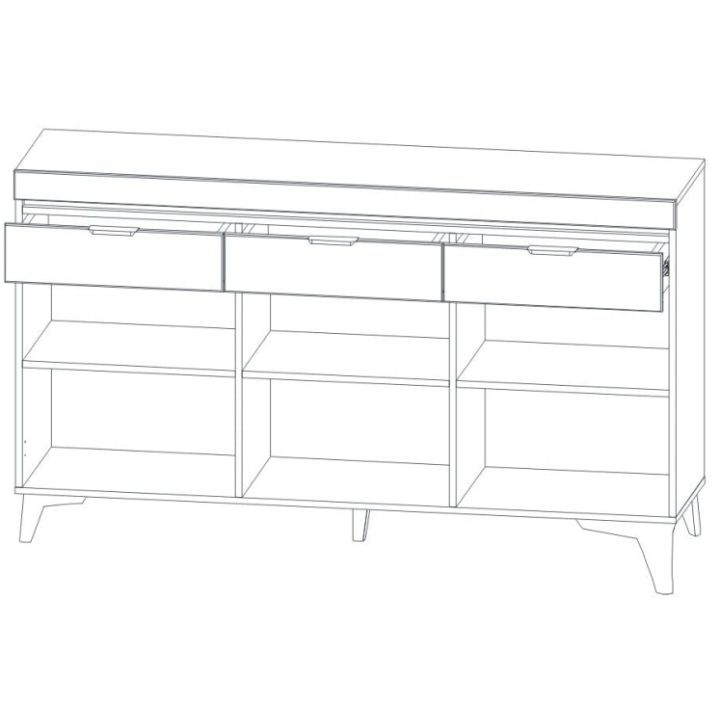 The Restol Baldur BDK-1 chest of drawers is a wide, durable TV or dining-zone storage unit for the living room or dining room. It features 3 full-extension drawers on ball-bearing slides and 3 lower cabinets, each with 1 internal shelf. The doors open sideways, and hinge sides can be set during installation to open from either side for flexible room layouts.
