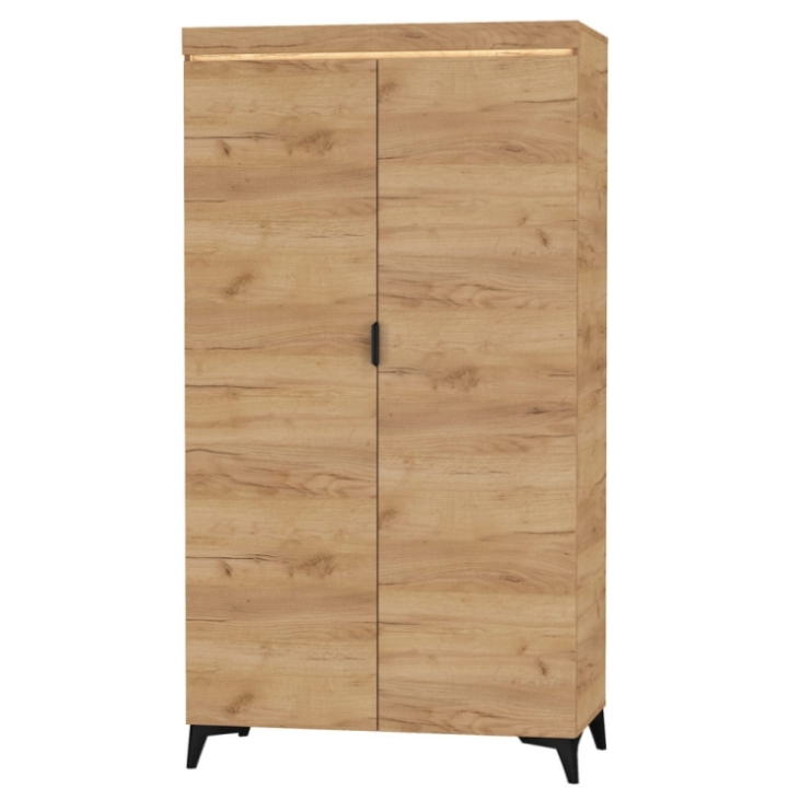 The Bragi BGS-1 wardrobe from Restol is a 2-door wardrobe measuring 105 cm wide, 55 cm deep, and 195 cm high. Both the body and the fronts feature a consistent Golden Craft Oak finish. This cabinet is a practical and stylish solution for organizing clothes in a bedroom or walk-in closet.