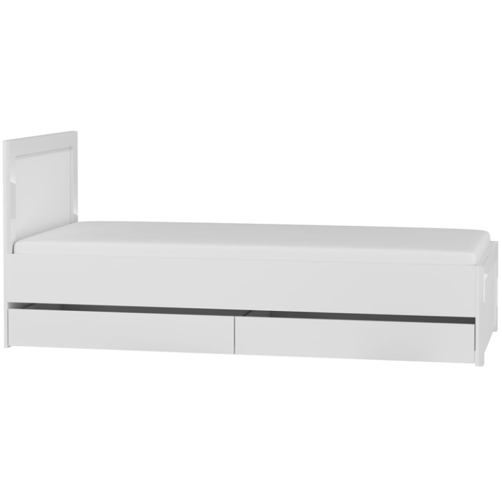 The bed offers a 90x200 cm sleeping surface. Designed for efficient space management, it features two large drawers in the lower section — perfect for storing bedding or additional items.