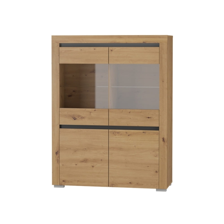 The upper section is glazed and equipped with glass shelves, ideal for showcasing decorative items, glassware, or collectibles. The lower cabinet, with a solid front, includes an additional laminated shelf, offering practical closed storage. The doors open using a profiled edge-grip, eliminating the need for traditional handles and enhancing the clean, minimalist look.