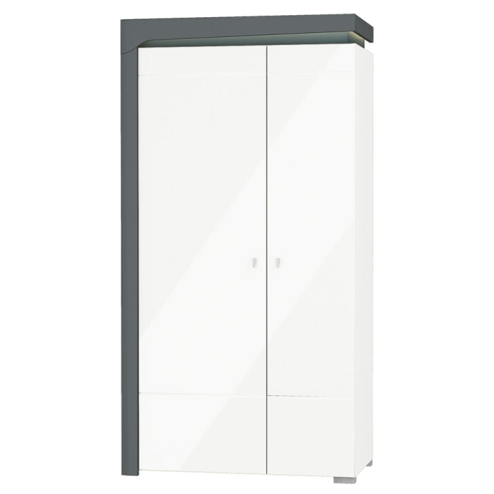 The wardrobe stands out with its contrasting color combination – an anthracite body paired with white high-gloss fronts. The body is made from durable laminated board, while the glossy fronts are crafted from MDF covered with PVC foil.