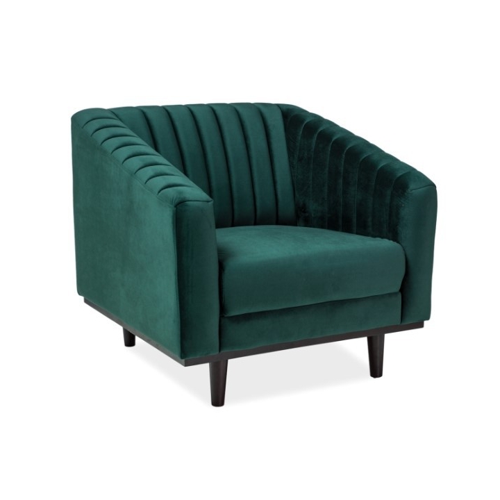 Exclusive Asprey Velvet 1 armchair by Signal, thanks to which you will immerse yourself in blissful relaxation and allow yourself a moment of forgetfulness. The Asprey armchair fits perfectly into the décor of elegant minimalist or retro-style living rooms, combining perfectly with other velvet furniture in similar colours. The design of the Asprey Velvet 1 armchair was inspired by a cubic cube - a structure almost perfect in its simplicity. Your comfort and convenience will be taken care of by the soft seat, backrest and armrests, which are covered in delicate velvet in bottle green. The decorative element became vertical stripes, which give the whole a smooth, harmonious form. The entire structure is set on four wooden legs, which will reinforce the stability of your piece of furniture.