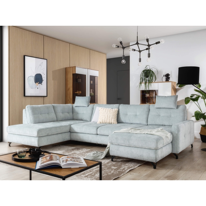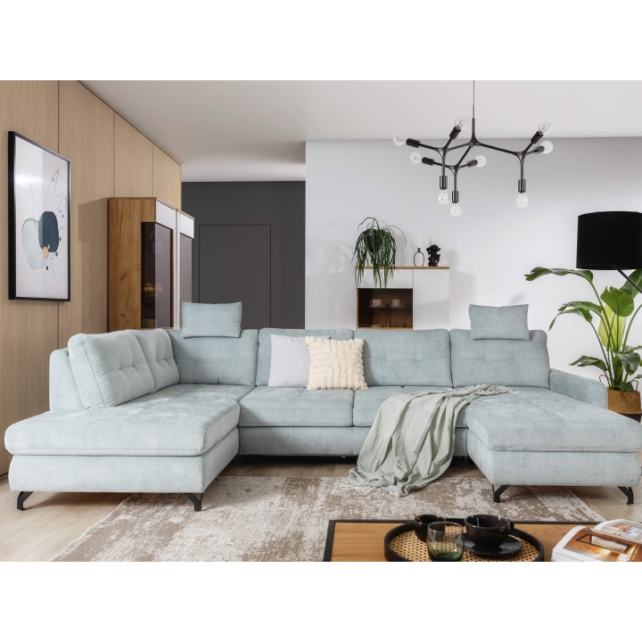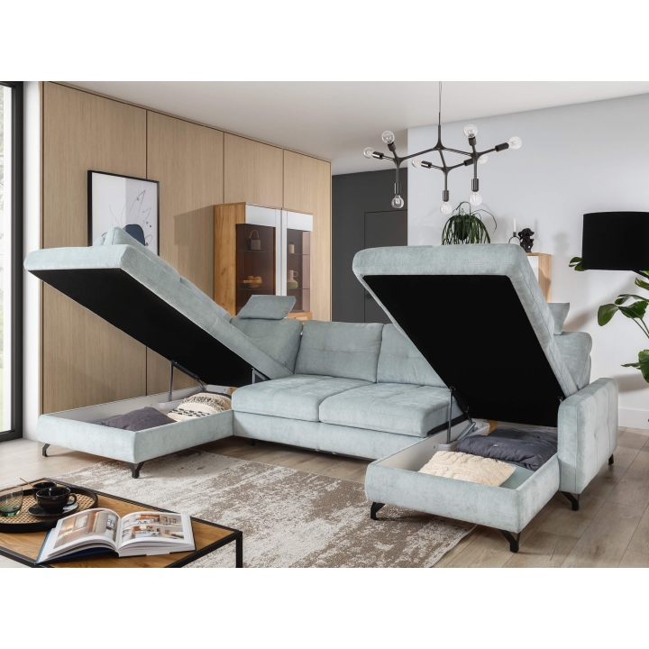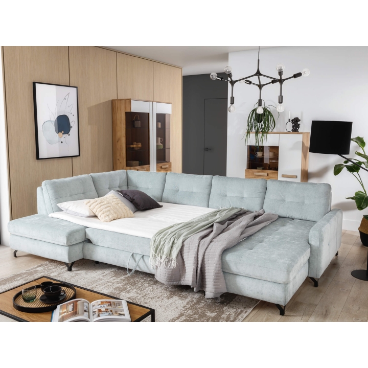 Nawe U combines a pull-out sleeping system, storage, and a wide seating layout. It is designed for interiors where a large and versatile sofa is required for daily use.