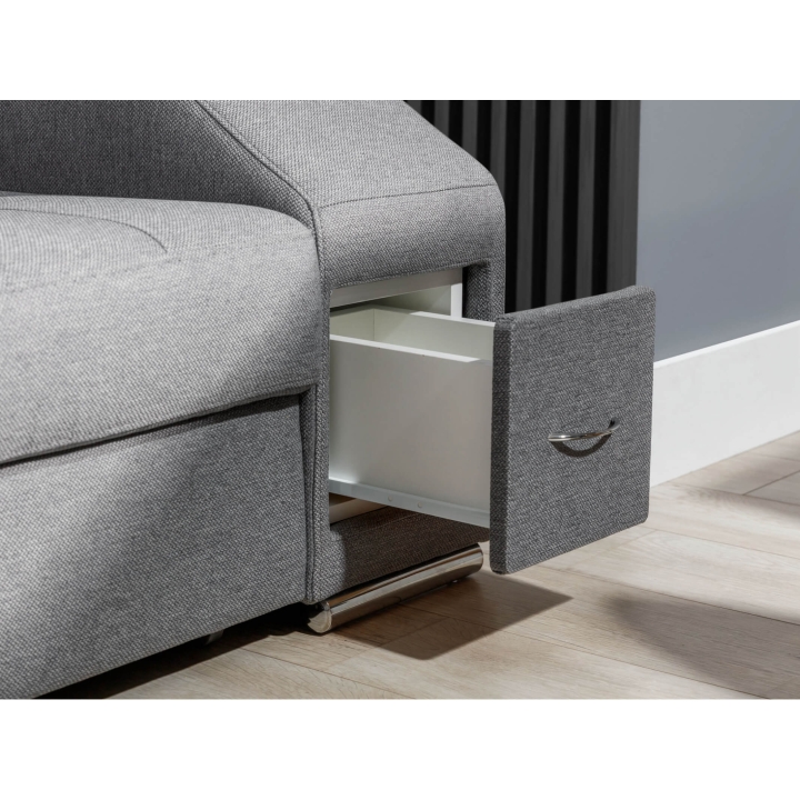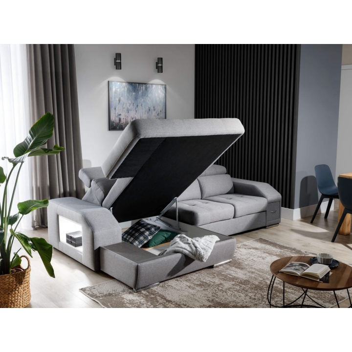 The Tulon S corner sofa includes a dolphin-type sleeping system and a built-in bedding storage box. Both the seat and backrest are filled with VP foam, which retains its shape and evenly distributes pressure during daily use.