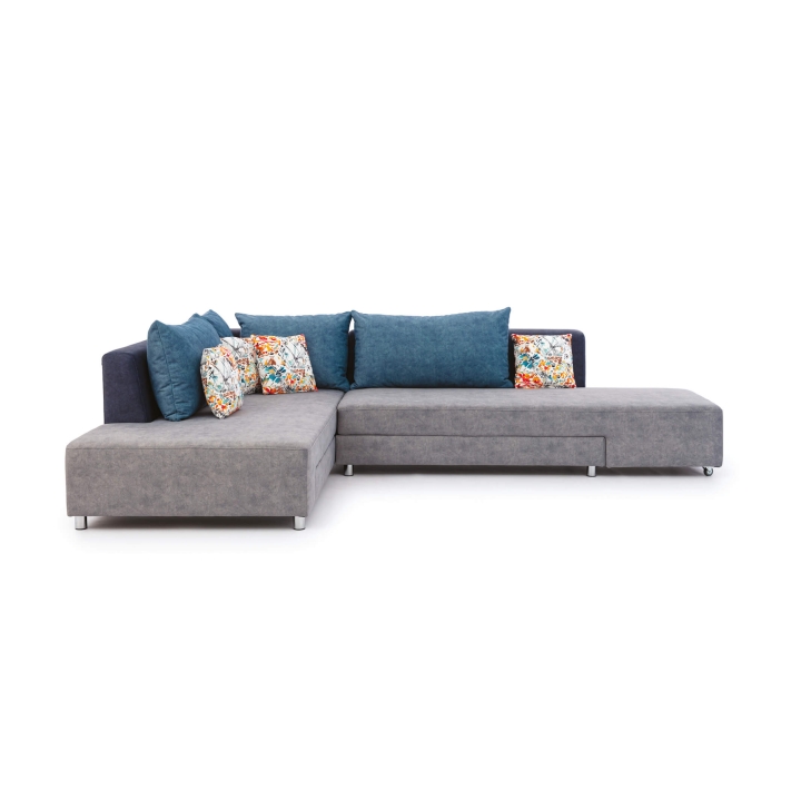 The Split L corner sofa features a dolphin-type sleeping system and a built-in bedding storage box. Both the seat and backrest are filled with HR foam, which adapts to pressure and maintains elasticity during daily use.