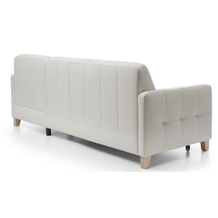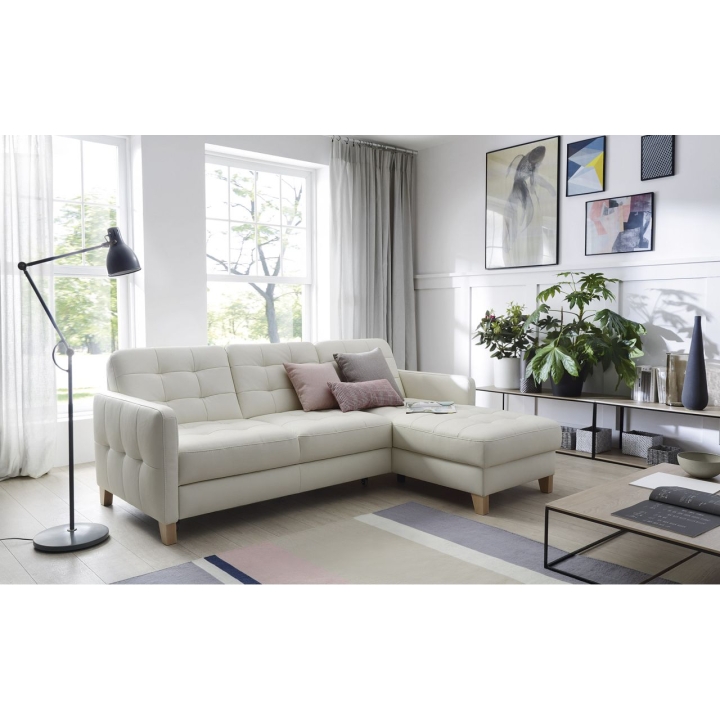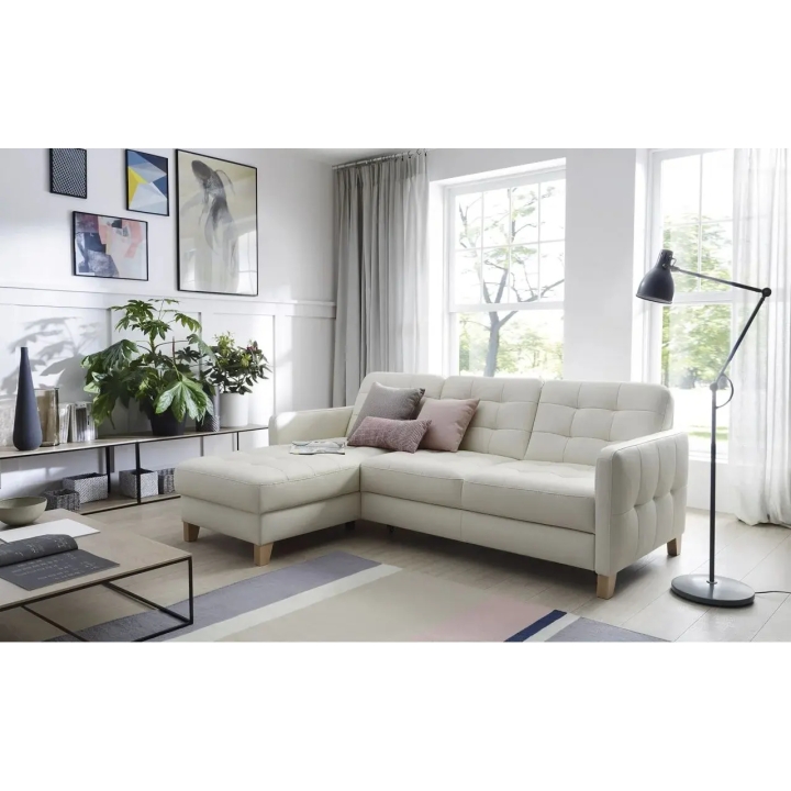 The Elio 2.5QF-1D(1)S corner sofa is distinguished by its modern look, which perfectly fits in with current interior design trends. Narrow sides and geometric quilting on the backrest, seat and sides give it a unique character. The higher wooden legs, the colour of which can be chosen from the available pattern book, add lightness and make it easier to keep the furniture clean underneath.