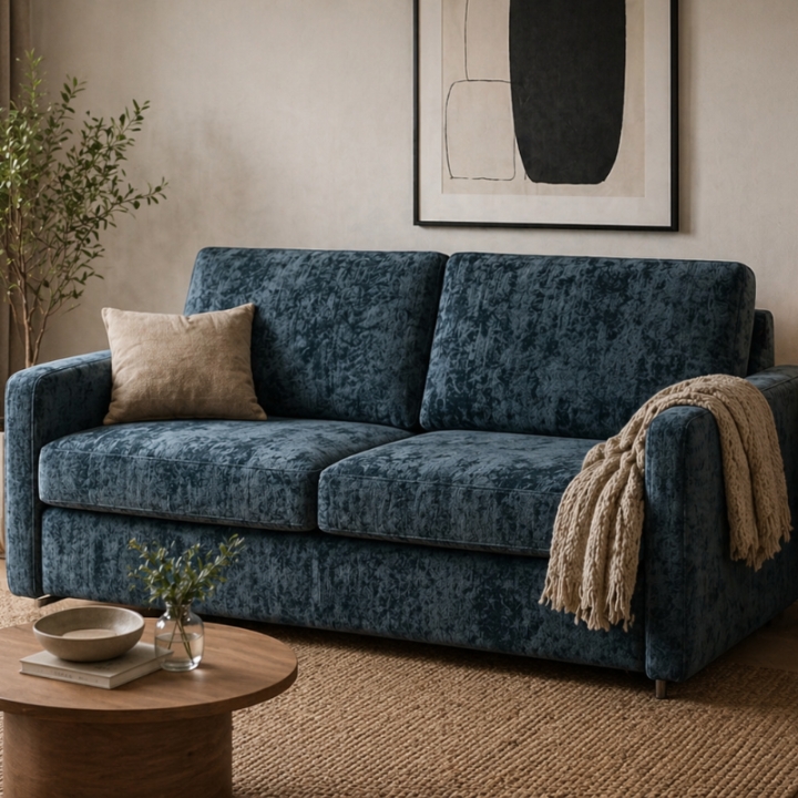 The dimensions of the sofa are 161 cm wide, 88 cm high and 98 cm deep. When unfolded, the total depth is 210 cm. The furniture is characterised by its simple, raw lines and smooth seats and backrests, while the narrow armrests with decorative stitching give the sofa a modern feel. The Ema 2(140) FF sofa in Wind 82 fabric is the ideal solution for those looking for a comfortable, modern and off-the-shelf sofa with a sleeping function.