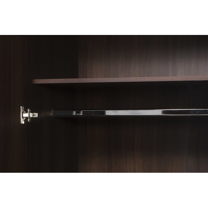 The wardrobe is equipped with mechanisms that ensure smooth and reliable door operation. In addition, the champagne-coloured metal handles give the furniture a subtle accent that completes the overall look. The wardrobe also has the option to be fixed to the wall for additional stability. The furniture is delivered in self-assembly condition.