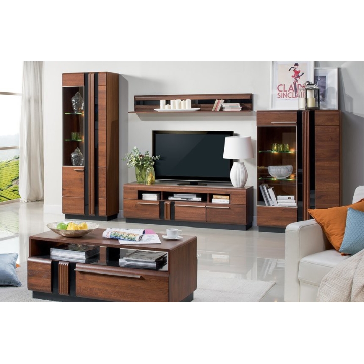 The characteristic colour of antique oak juxtaposed with black tempered glass elements creates a harmonious and aesthetic composition. The subtle grooving, which decorates the design, refers to the style of the Porti collection, giving the shelf a unique character. The shelf can be used on its own or be a perfect complement to other furniture from the same series, such as a RTV cabinet or a chest of drawers.