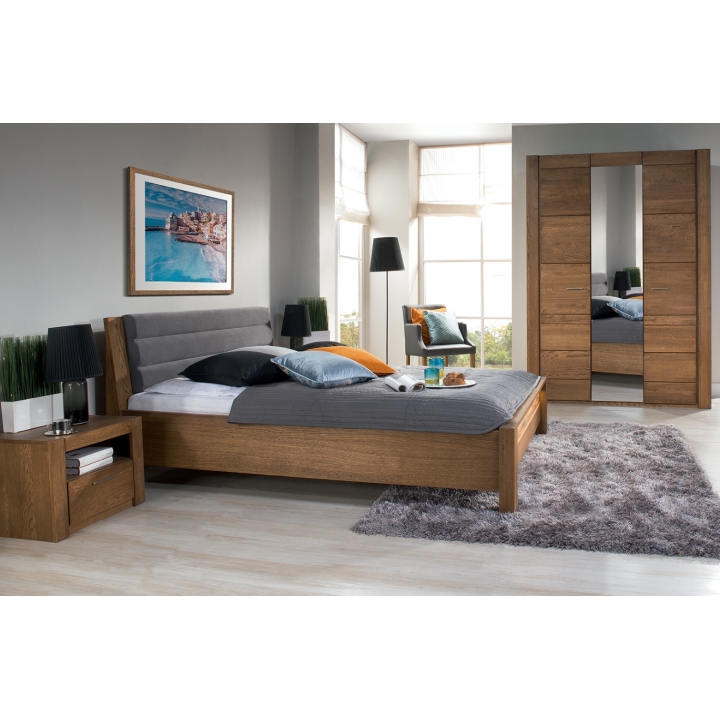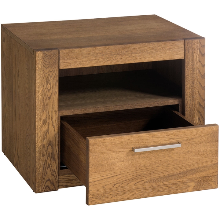 Its dimensions are 54 cm wide, 42 cm high and 42 cm deep, which makes it a perfect addition to any bedroom. The front was made of solid oak wood with brushed elements, giving the surface elegance and a unique character. The carcass consists of furniture board in natural oak veneer, which emphasises the natural style of the furniture.
