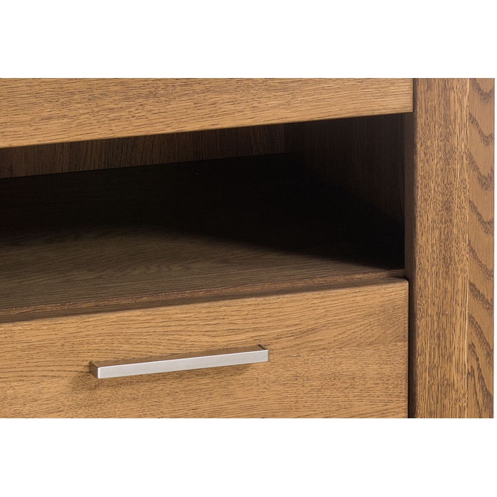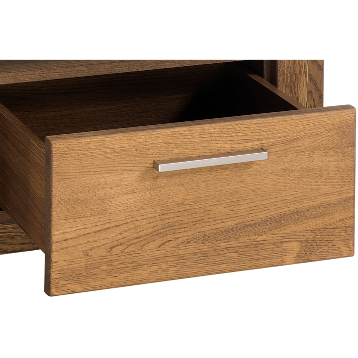 The surface has been carefully finished with oil, which guarantees durability and emphasises the aesthetic qualities of rustic oak. An additional asset is the metal handle, which gives the furniture a modern touch. Equipped with one practical drawer with a soft-closing mechanism, the cabinet is an excellent choice for those who appreciate quality and style.