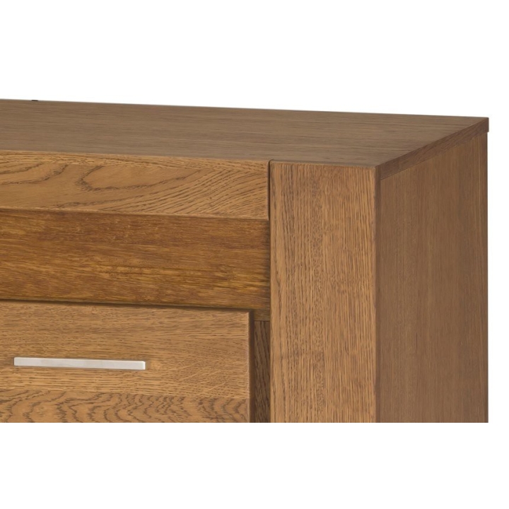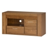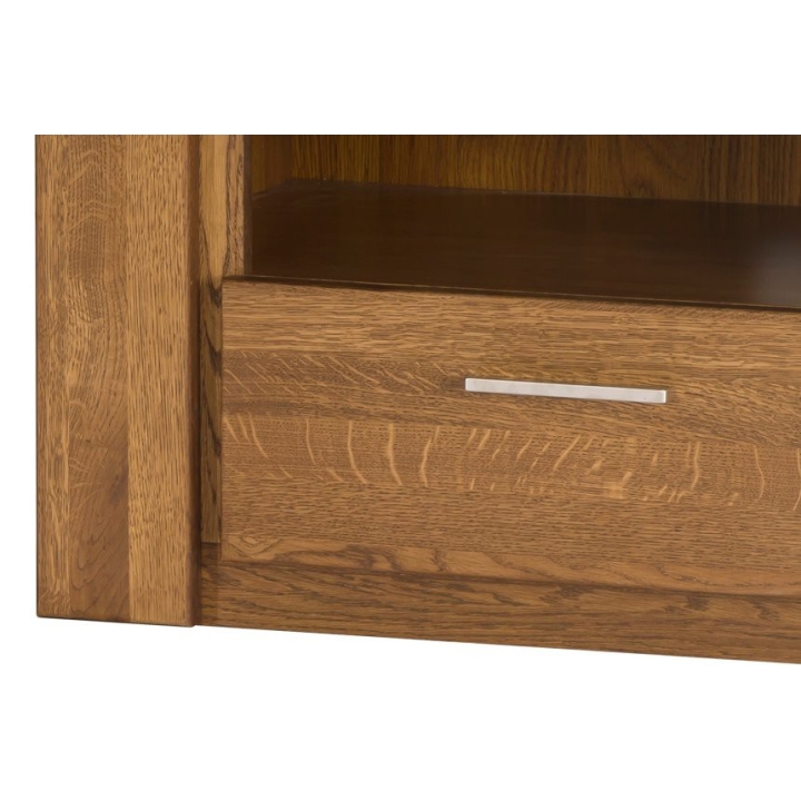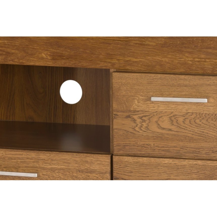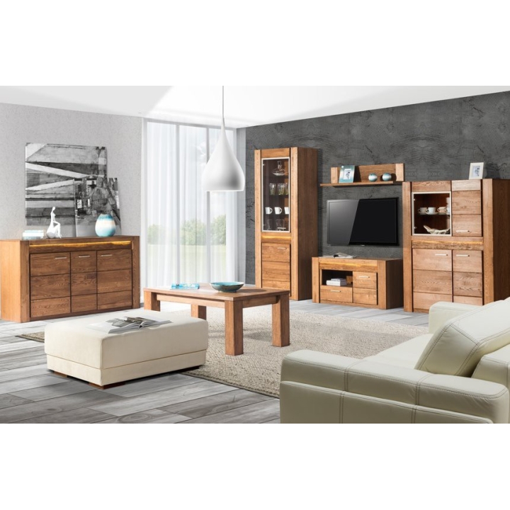 The Velvet Type 24 RTV cabinet is made of solid oak, distinguished by its rustic oak colouring and classic design. The cabinet has one door and one drawer with a soft-closing mechanism, which provides sufficient space for storing media equipment, remote controls or other accessories. Brushed and rough-hewn wood inlays, additionally highlighted by LED lighting as standard, give it a unique, natural character.