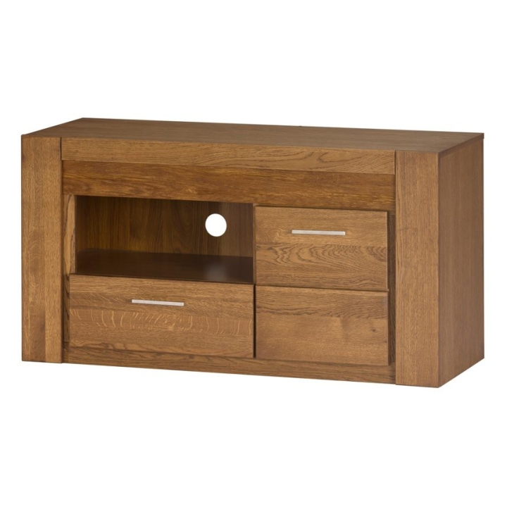 The champagne-coloured metal handles complete the look, adding a subtle touch to the warm colour of the wood. The structure of the cabinet is durable and stable, making it the perfect support for the TV and other RTV equipment. The furniture measures 111 cm wide, 58 cm high and 42 cm deep, making it a perfect fit in both spacious and smaller rooms.