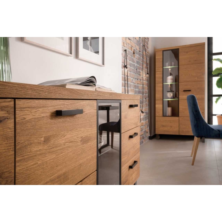 The structure of the cabinet is based on stable black legs in the shape of skids, which give it a loft character. Another advantage is the quiet closing system, ensuring comfort of use. The furniture is equipped with the option of additional LED lighting, which can be purchased separately to further enhance the modern look of the display cabinet. Matching model: 3-L-BN-3-0000-01, and 4-L-WL-6-0000-01 possibly with capacitive switch.