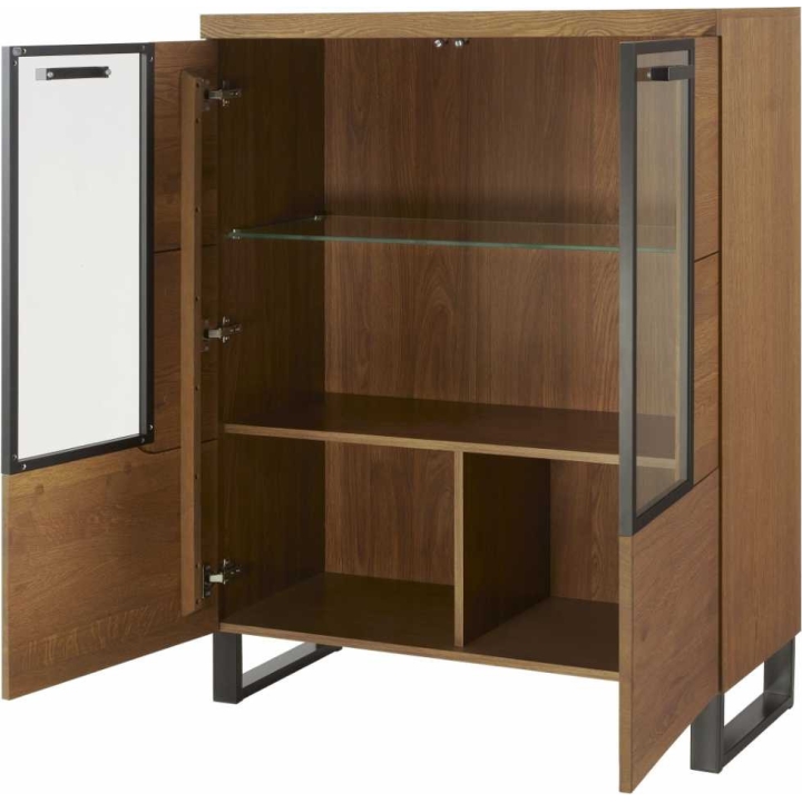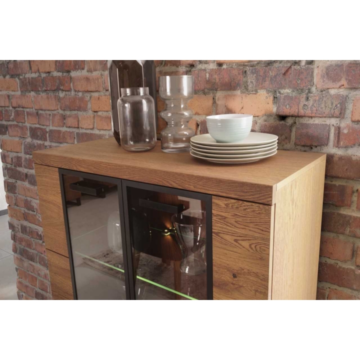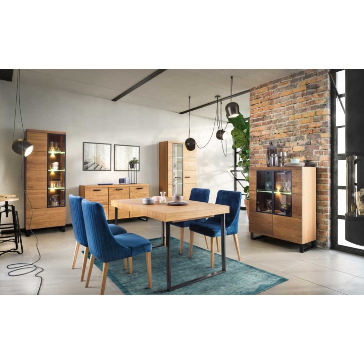 The display cabinet is made of solid brushed wood and furniture board in natural oak veneer, which guarantees its durability and aesthetic appearance. Black metal handles and frames and skid-shaped legs complete its loft character. The product is also equipped with a soft-close system for comfortable use.