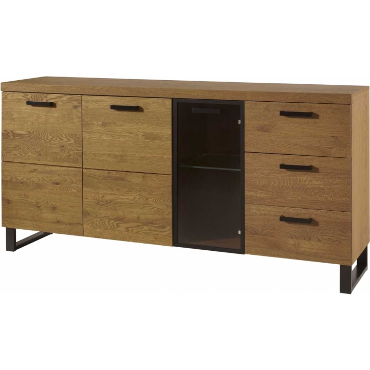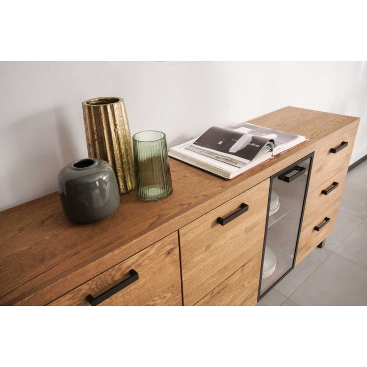 The furniture is finished in a warm shade of rustic oak with elements in matte black, giving it a natural yet contemporary look. Both the fronts and the cabinet are made from high quality materials. The fronts made of solid, deeply brushed wood combined with toughened glass and the body made of furniture board in natural oak veneer guarantee durability and aesthetics for years to come.