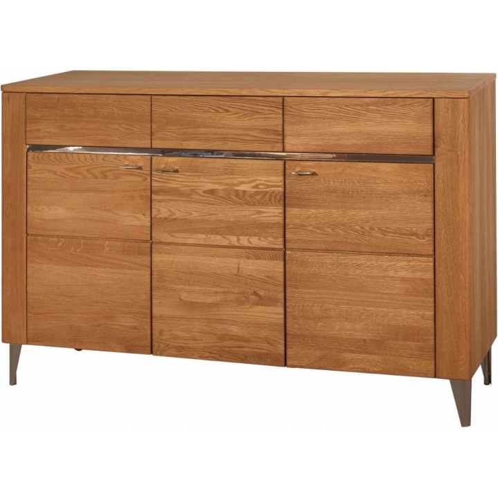 Made of solid brushed oak wood and furniture board in natural oak veneer, the Latina chest of drawers also impresses with its beautiful colour scheme in a warm shade of oiled honey oak, which gives the interior a cosy and elegant feel. In addition, the design of the chest of drawers rests on high silver legs, which not only provide stability but also give the furniture a light appearance.