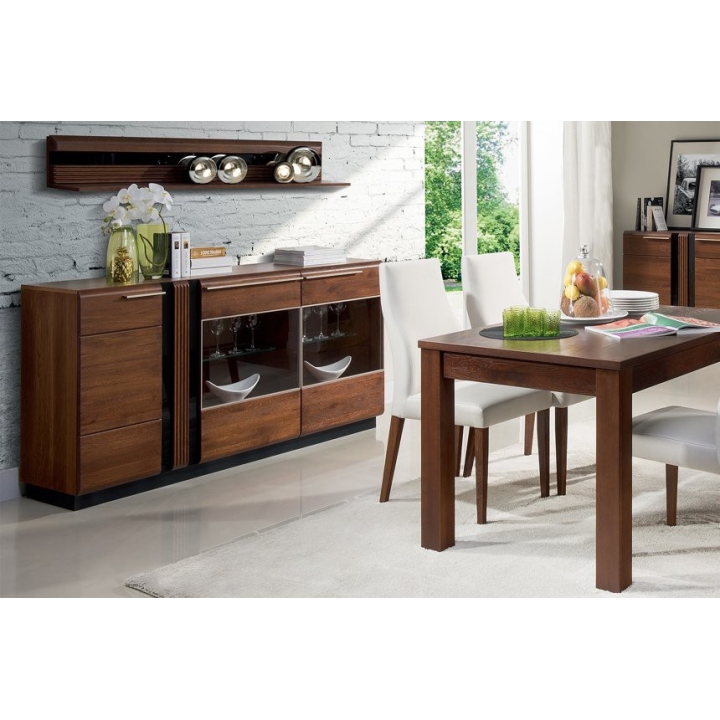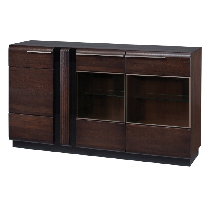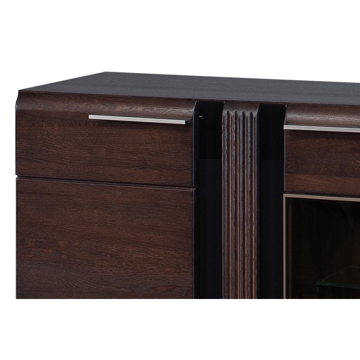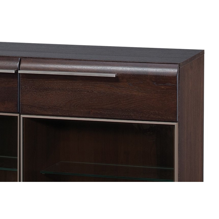 The entire piece is made of high quality materials. The solid wood sideboard fronts provide solidity and durability, while the toughened glass in the doors has a striking sheen that harmonises with the subtle colour of the chocolate oak.