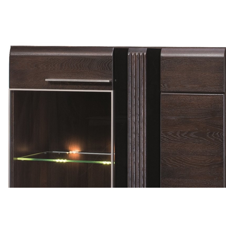The Porti 15 showcase is a left-sided, two-door piece of furniture with compact dimensions of 95 cm wide, 145 cm high and 42 cm deep. Maintained in the colour scheme of chocolate oak with the addition of black tempered glass, it fits perfectly into various interior styles. The solid wood fronts, enriched with glass elements, create a harmonious whole, and the decorative grooves give the display a unique character. The stable structure made of board in natural oak veneer on a black plinth ensures solidity and an aesthetic appearance.