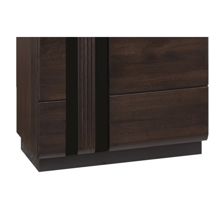 The Porti 11 showcase is a two-door piece of furniture measuring 66 cm wide, 198 cm high and 42 cm deep. Made in the colour combination of chocolate oak and black, it brings a unique touch to the interior. The solid wood fronts, enriched with tempered glass, ensure durability and aesthetics. Fluted details and champagne-coloured metal handles add a distinctive touch to the overall design, while the plinth in black emphasises the solidity of the construction.