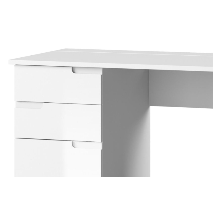 The desk is made of durable materials such as MDF covered with PVC foil on the fronts and laminated furniture board on the body. The non- protruding handles, characteristic of the Selene collection, subtly integrated into the structure of the fronts, give the furniture a coherent and modern look. The stability of the structure is ensured by low legs which at the same time make it easier to keep the furniture clean underneath.