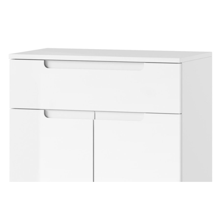 The cabinet is equipped with a 2-door front and a shelf and one drawer behind it , which allows for convenient storage of both small items and larger items. The handles, characteristic of the collection, subtly integrated into the structure of the fronts, add a modern look and emphasise the minimalist aesthetic of the furniture.