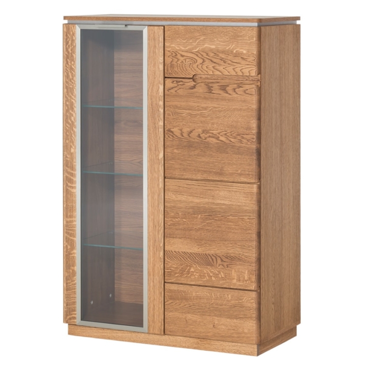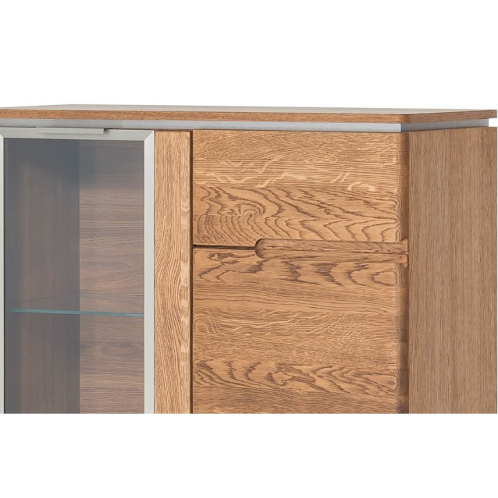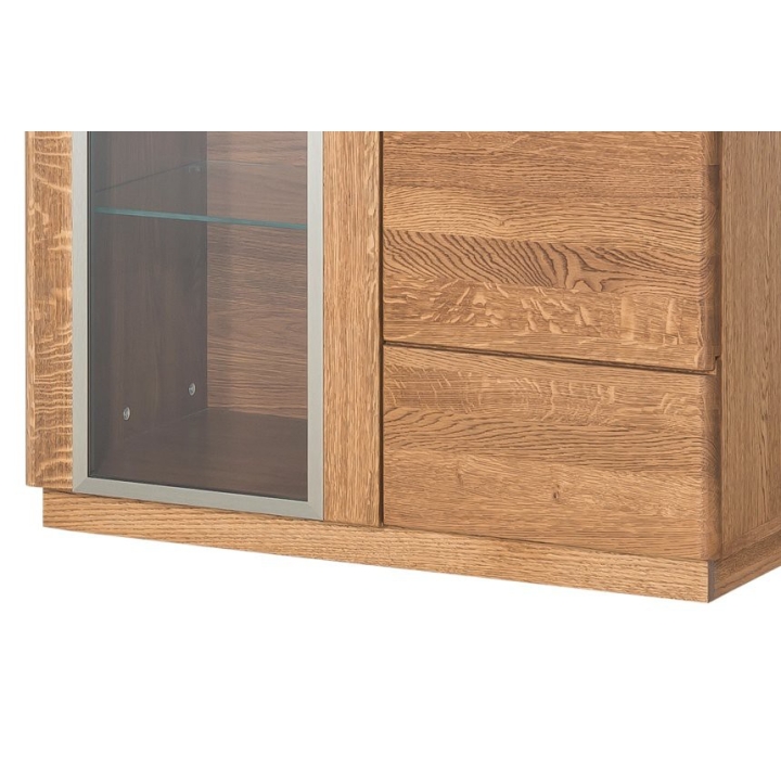 The display cabinet is equipped with metal handles integrated into the frame, which makes it easy to use and emphasises the modern design. In addition, there is an optional LED light that will illuminate the interior of the display unit, adding to its unique character. The rustic oak finish gives the furniture a natural warmth, emphasising its versatility and timeless style. The Montenegro display cabinet is the ideal choice for those looking for solid and stylish furniture for their living room.