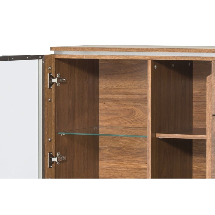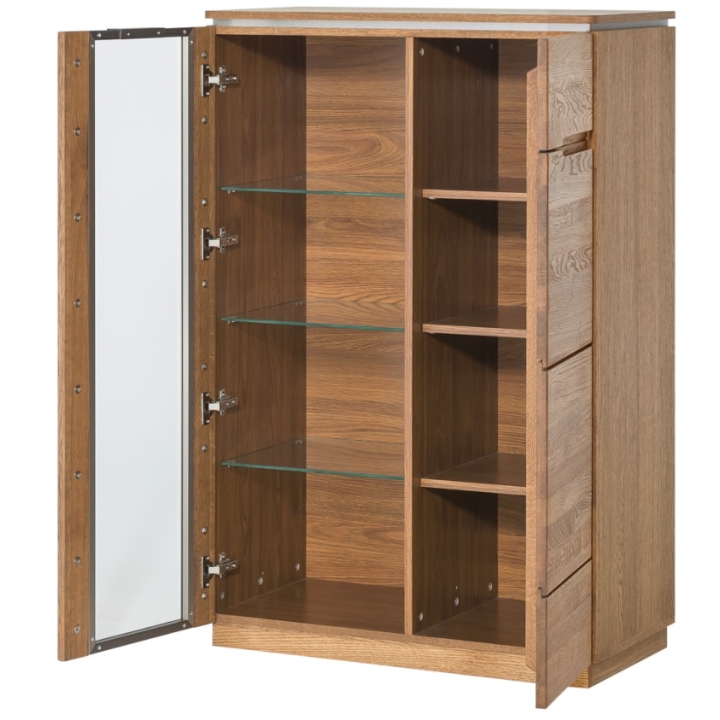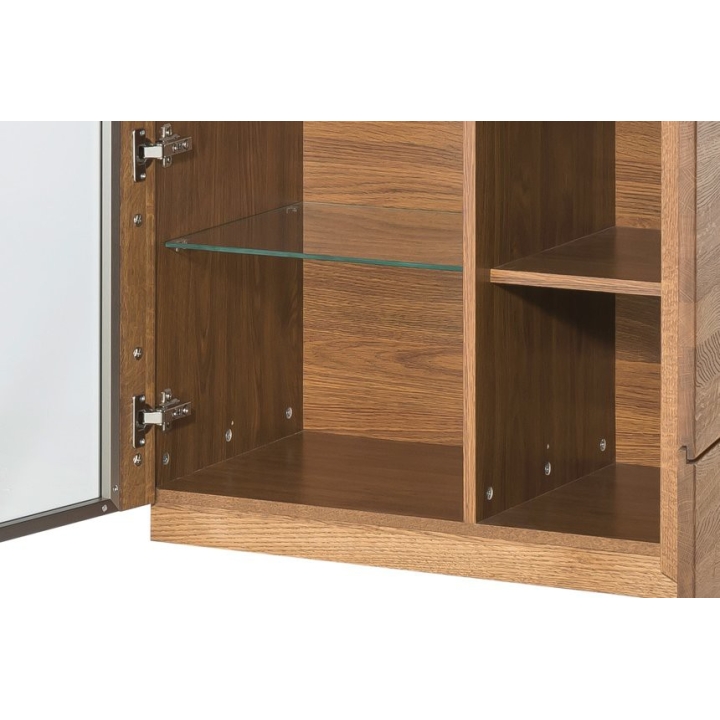 Made of solid wood and veneered furniture board, the display cabinet is distinguished by its solidity and careful workmanship. The glazed front made of tempered brushed glass adds lightness and a modern touch, while the brushed metal inserts emphasise its unique style. Inside, there are six shelves, three of which are glass, allowing you to display your decoration, collection or crockery, while three furniture board shelves provide additional storage space.