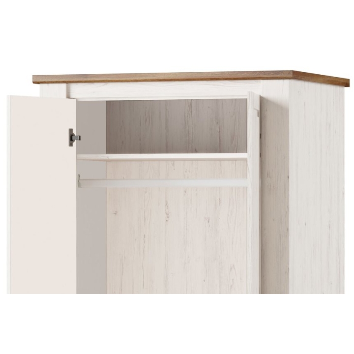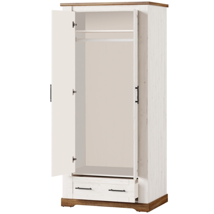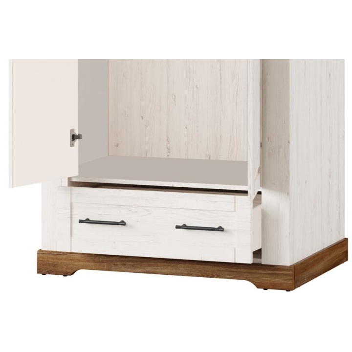 Inside the wardrobe there is a full-length clothes bar and a small shelf, ideal for storing additional accessories. Additional space for organising clothes is provided by a capacious drawer located under the door. The furniture is made of high quality materials, such as PVC-coated MDF front and furniture board body, which guarantees durability and aesthetic appearance. The wardrobe is equipped with a quiet closing system, which increases the comfort of everyday use, and metal handles in the colour of patinated silver emphasise its classic character.