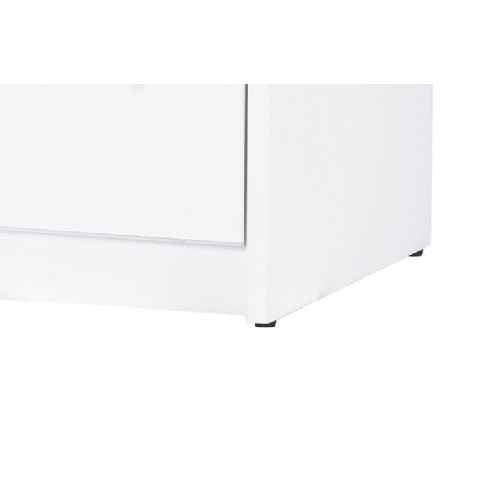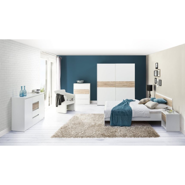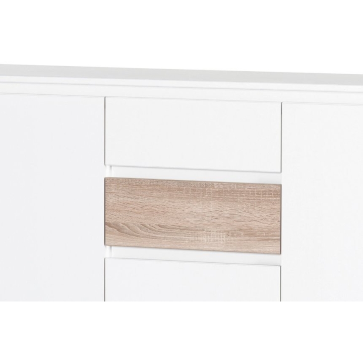 On the sides of the commode there are two cabinets with two shelves with a maximum load capacity of 7 kg, while in the central part there are four capacious drawers (load capacity 3 kg). This is enough space for you to easily fit all your daily necessities. The sterile white of the cabinet is broken by the sonoma oak colour decorating one of the drawers. The presented chest of drawers can be supplemented with other furniture from the collection available on our website.