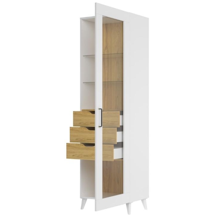 The showcase on high white legs (12cm) has hinges mounted on the right side, which means that the door opens to the right. The front is made of MDF furniture board covered with PVC foil and foil in woodgrain décor, and the body is made of furniture board foiled in white. Steel handles in matt black with a gold finish add a touch of sophistication to the furniture. The display cabinet is equipped with one glazed door, which allows the stored items to be displayed. The interior of the display cabinet contains four shelves and three stylish drawers, each of which can hold a maximum of 3 kg. The internal dimensions of the drawers are 51.3 cm wide, 8.6 cm high and 28.7 cm deep. If you want additional lighting, the option of lighting for the glass shelf is available, which will emphasise the elegance of the display cabinet. Convenience of use is taken care of.