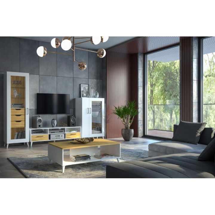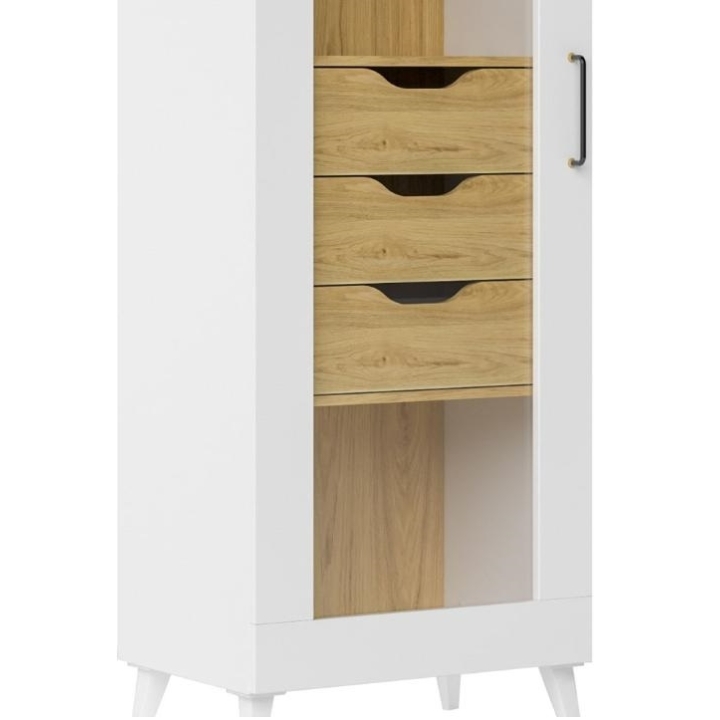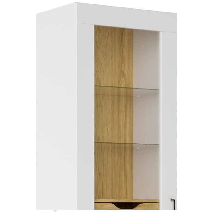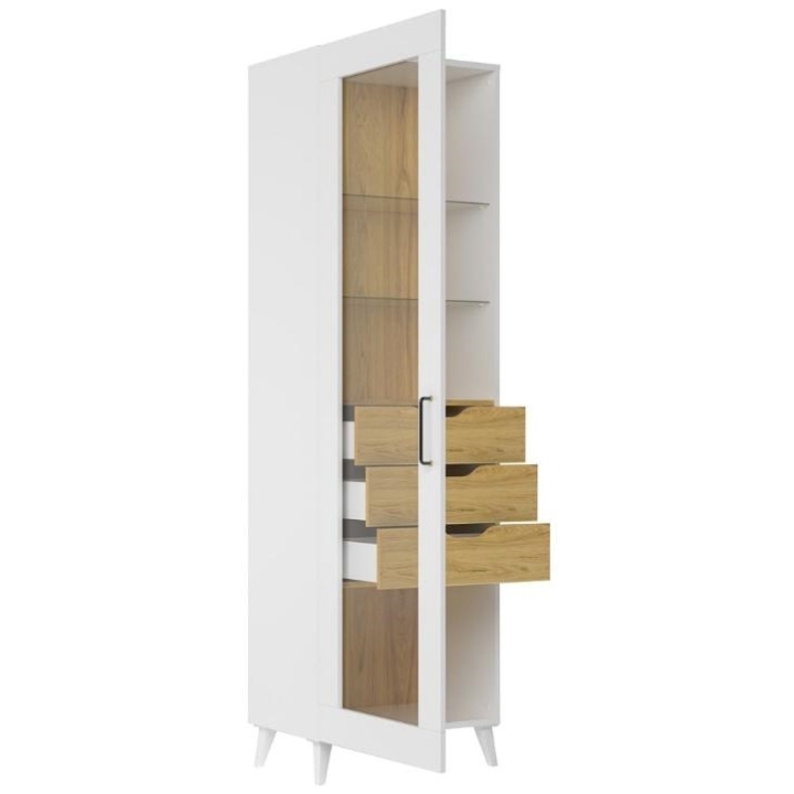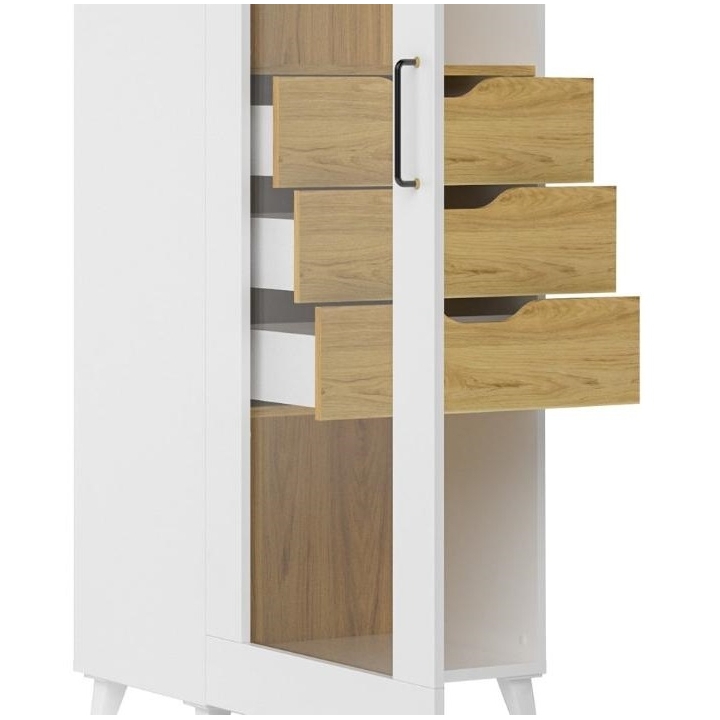 Barris 11 showcase on white high legs ( 12 cm) is equipped with one glass door, which allows comfortable access to the stored items. The interior of the furniture contains four shelves and three drawers, which can each hold up to 3 kg. The internal dimensions of the drawers are 51.3 cm wide, 8.6 cm high and 28.7 cm deep. In addition, the display cabinet offers the option of illuminating the glass shelf, which will perfectly highlight its subtle character and give the interior a warm glow. For the sake of convenience of use, the furniture is equipped with a quiet closing system, which makes using it even more comfortable.