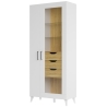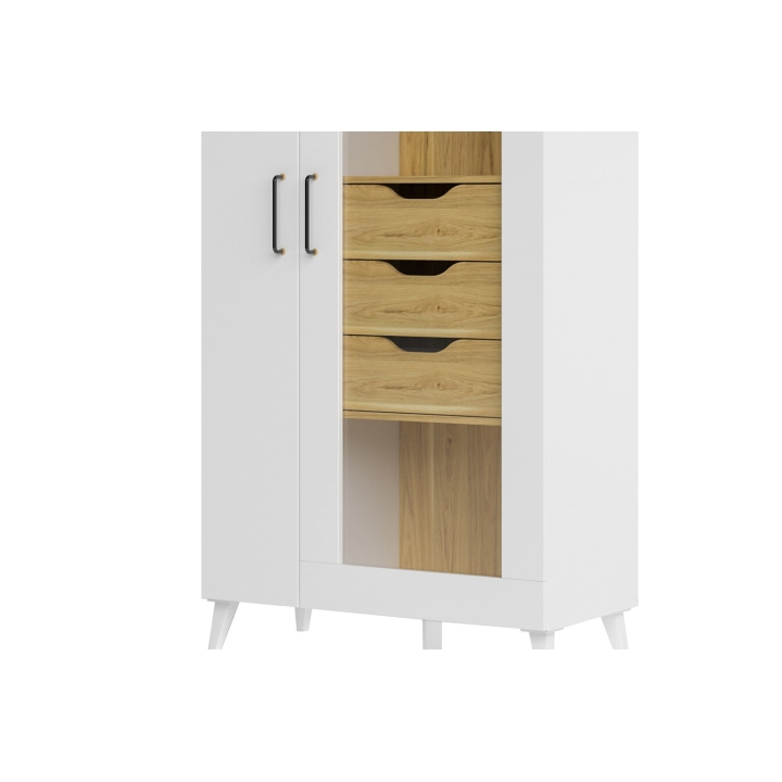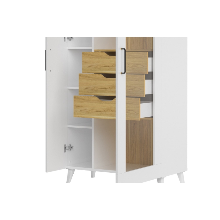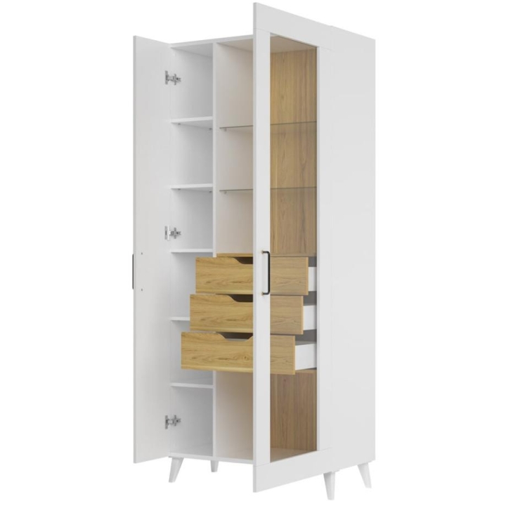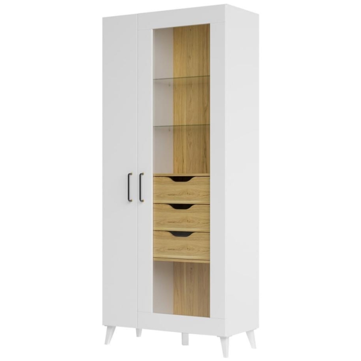 Solid workmanship is a guarantee of durability. The front of the cabinet was made of MDF furniture board coated with PVC foil and foil in wood-like décor, while the body was made of furniture board coated in white. The steel handles in black matt with gold finish and the 12 cm high white legs add elegance and sophistication. The display cabinet has a pair of doors, one of which is glazed, which allow for the display of stored items. The interior is equipped with 10 shelves and 3 stylish drawers, with a maximum load capacity of 3 kg each. The internal dimensions of the drawers are 51.3 cm wide, 8.6 cm high and 28.7 cm deep.