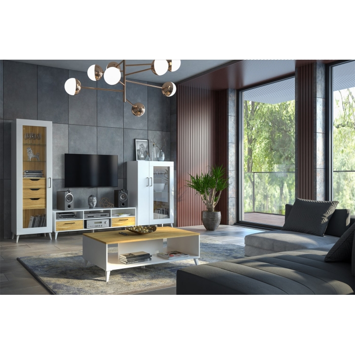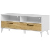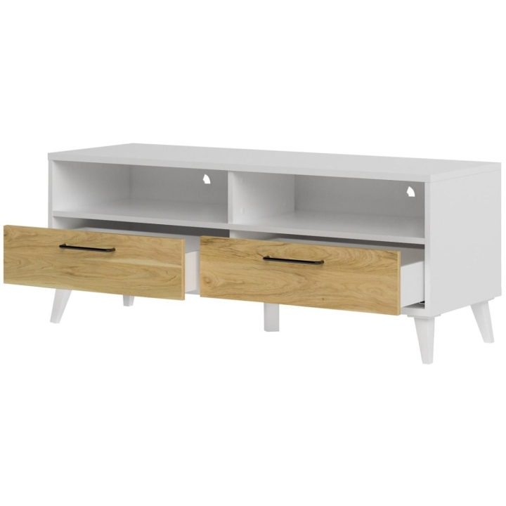 Solid workmanship is a guarantee of durability. The front of the cabinet is made of MDF furniture board coated with PVC foil and foil in wood-like décor, while the body is made of furniture board coated in white. Steel handles in black matt with a gold finish emphasise the stylish character of the furniture. The cabinet is equipped with two drawers and two shelves with cable openings, allowing for easy organisation of space and tidiness in the living room. The internal dimensions of the drawers are 53.7 cm wide, 8.6 cm high and 28.7 cm deep, and the maximum drawer load capacity is 3 kg. In addition, the cabinet has two decoder bays for convenient storage of media devices - the dimensions of the bays are 57.6 cm wide, 37.8 cm deep and 14.2 cm high.