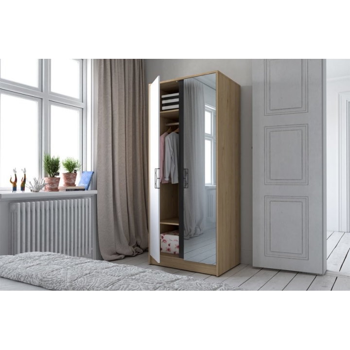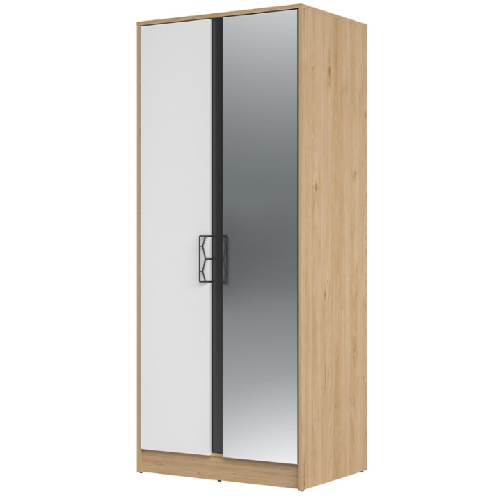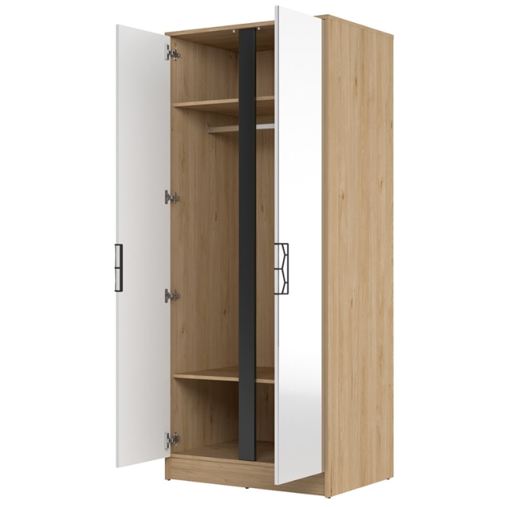 Inside the wardrobe there is a hanger bar and two shelves, which provides ample storage space and helps with organisation. The wardrobe is 200 cm high, 84 cm wide and 60 cm deep, making it an ideal choice for both the bedroom and living room. The wardrobe sits on a plinth which gives it stability and the wall fixing components included will make it safe to use.
