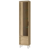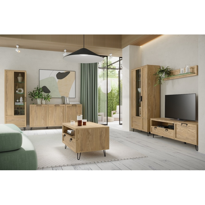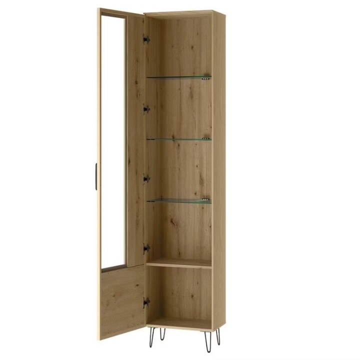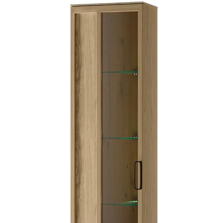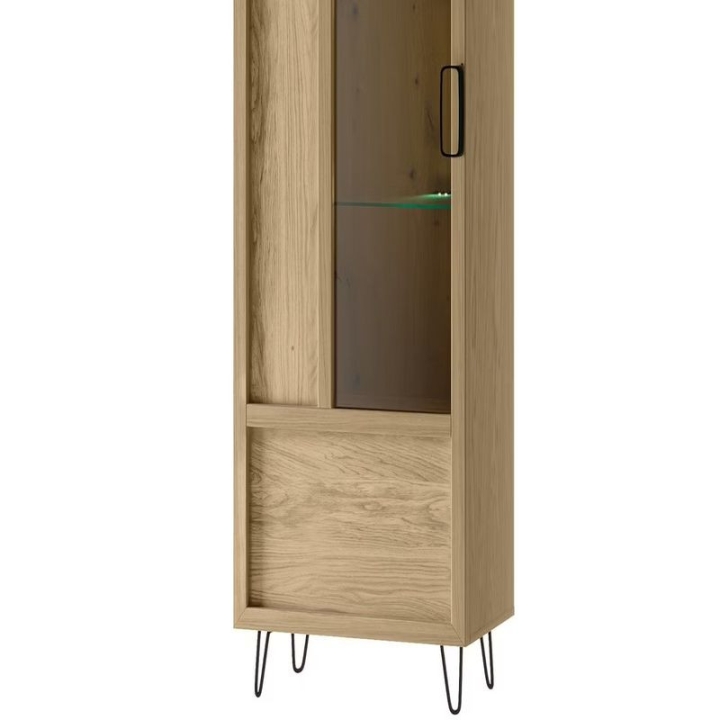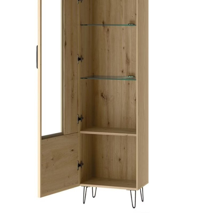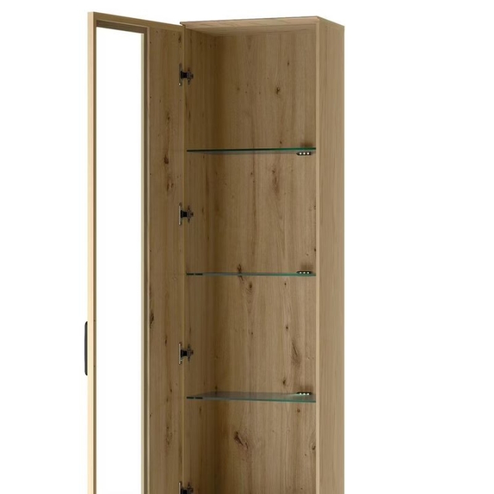 The furniture is made of solid oak wood on the front, and tempered glass (clear) adds elegance and lightness to the whole structure. The body of the display cabinet is made of an outer furniture board in natural oak veneer, and the inner part is finished with foiled board, which ensures durability and resistance to damage. The colour scheme of oak artisan oil gives the display cabinet a warm, natural look that blends perfectly with modern, minimalist spaces.