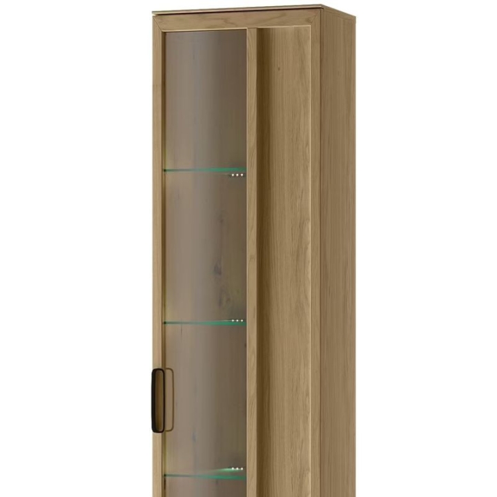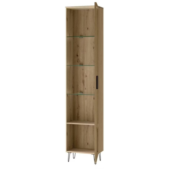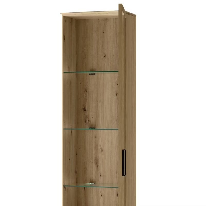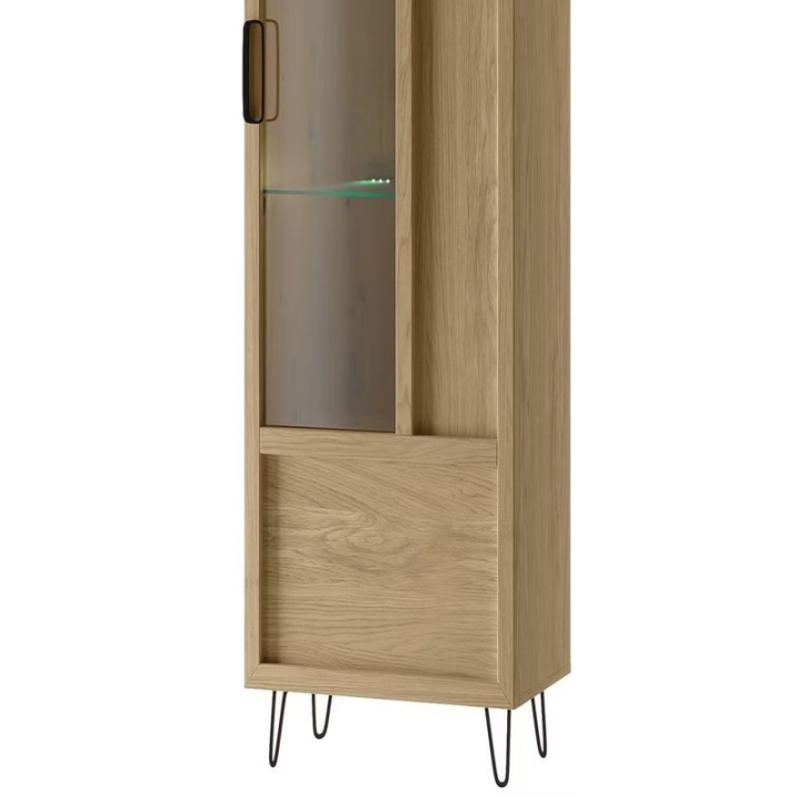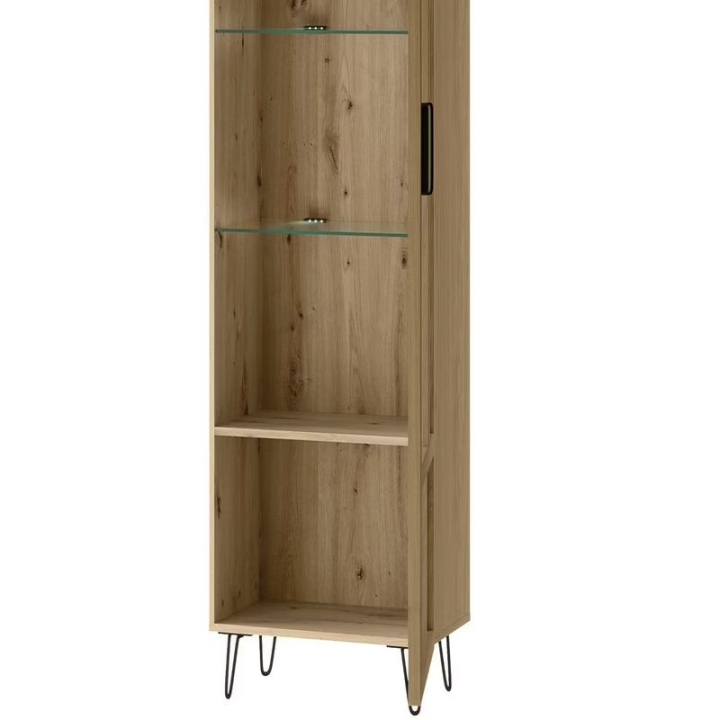 Made from high quality materials, the display cabinet features solid oak fronts with a soft-closing mechanism, adding to its durability and elegance. The clear tempered glass works well with the overall design, while ensuring safety and lightness. The body of the cabinet is made of an external furniture board in natural oak veneer, which adds to the natural character of the furniture, while the internal part made of foiled board guarantees resistance to damage. The colour scheme of oak artisan oil gives the display cabinet a warm, cosy look that suits many modern interiors and the black legs and handles add class and elegance.
