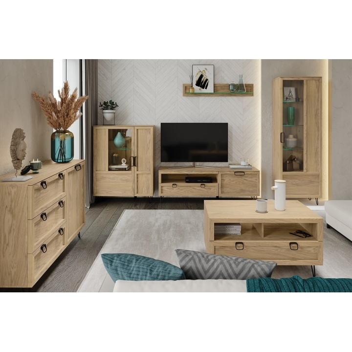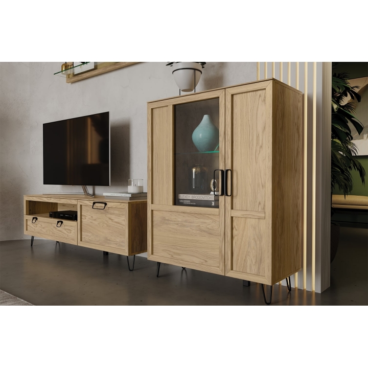 The cabinet is made of solid oak wood on the front which ensures its durability and elegant appearance. The body of the furniture is an external furniture board in natural oak veneer, and the interior has been finished with a foiled board, which ensures resistance to damage and ease of maintenance. The colour scheme of oak artisan oil gives the cabinet a warm and natural look that blends perfectly with modern spaces.